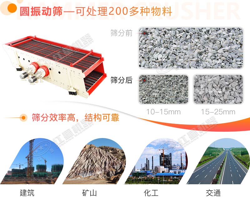 圓振動篩圓振動篩是一種做圓形振動、多層數、新型振動篩。圓振動篩采用筒體式偏心軸激振器及偏塊調節振幅,物料篩淌線長,篩分規格多,具有結構可靠、激振力強、篩分效率高、振動噪音小、堅固耐用、維修方便、使用安全等特點,該振動篩廣泛應用于礦山、建材、交通、能源、化工等行業的產品分級。